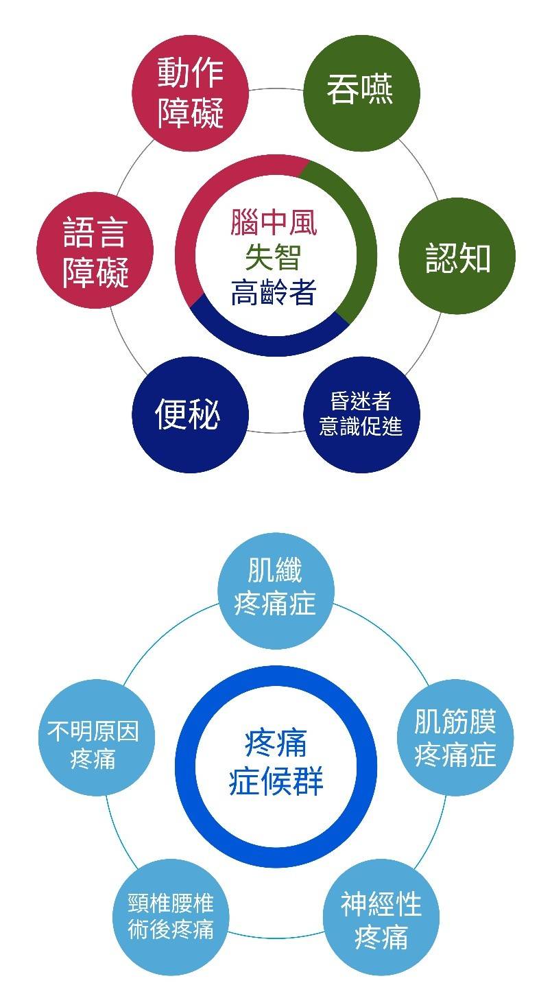 適合接受此療程的疾病為:腦中風、失智症、帕金森氏症、高齡者、各種大腦退化性疾病,伴隨動作障礙、語言障礙、吞咽障礙、認知功能退化、呼吸功能障礙、膀胱過動症、尿失禁,便秘、不明原因疼痛、肌纖疼痛症、術後疼痛症候群、癌症疼痛、面神經麻痺、耳鳴、頭暈等等。