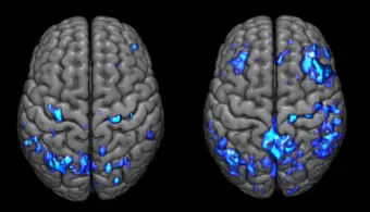 圖:rTMS 治療後(右圖)大腦活性區域(藍色區域)增加