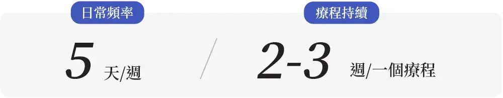 A:針對不同功能障礙,所需療程也不同。一般需要至少兩個療程(20次)有明顯效果。一個療程10次,最好不間斷連續每天治療效果最佳 (週六日休息)。